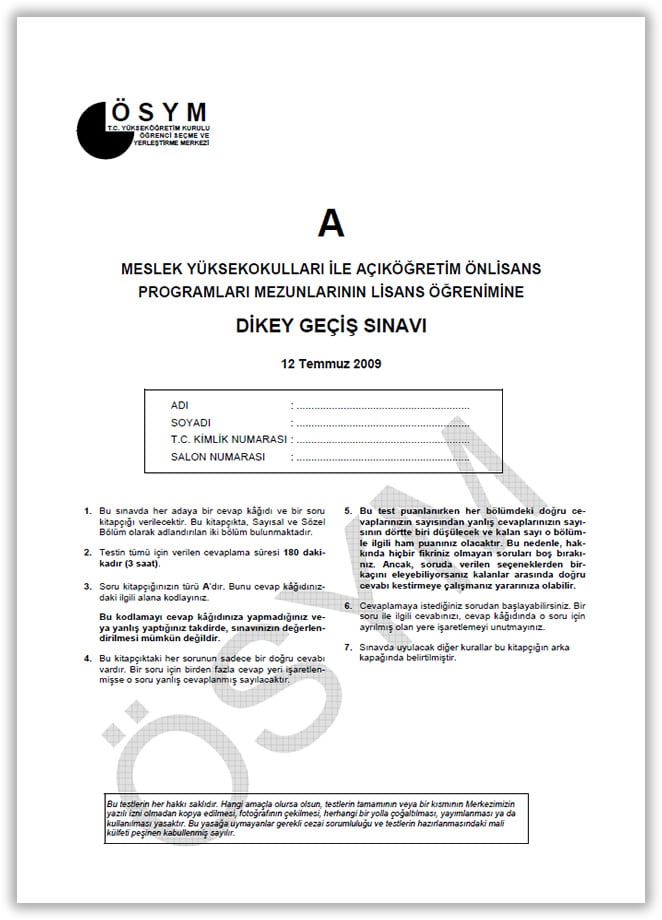 2009 Dikey Geçiş Sınavı (DGS) 12 Temmuz 2009 tarihinde yapılan Dikey Geçiş Sınavı Soru ve Cevaplarını kitapçığı indirerek inceleyebilirsiniz. KİTAPÇIĞI İNDİR DGS Sınav Listesine Geri dön Tüm sınav listesine geri dön