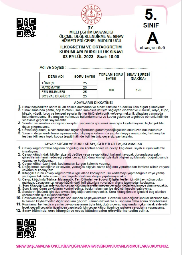 2023 MEB 5. Sınıf Bursluluk Sınavı 3 Eylül 2023 tarihinde yapılan 5. Sınıf Bursluluk Sınavı Soru ve Cevaplarını aşağıdaki kitapçığı indirerek inceleyebilirsiniz. KİTAPÇIĞI İNDİR MEB Bursluluk Sınav Listesine Geri dön ANA SAYFAYA dön